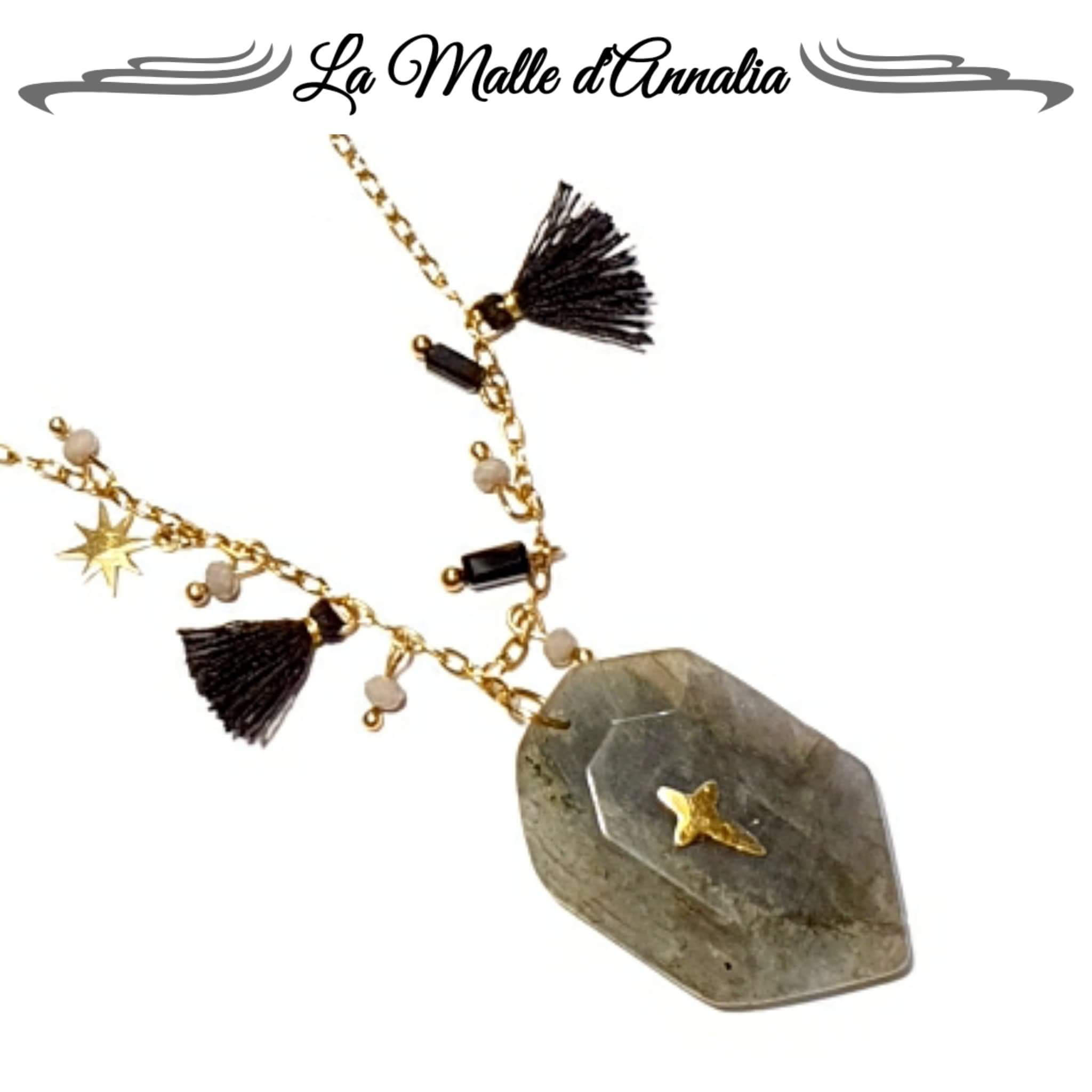 Sautoir en acier inoxydable avec pierre naturelle et gros pendentif